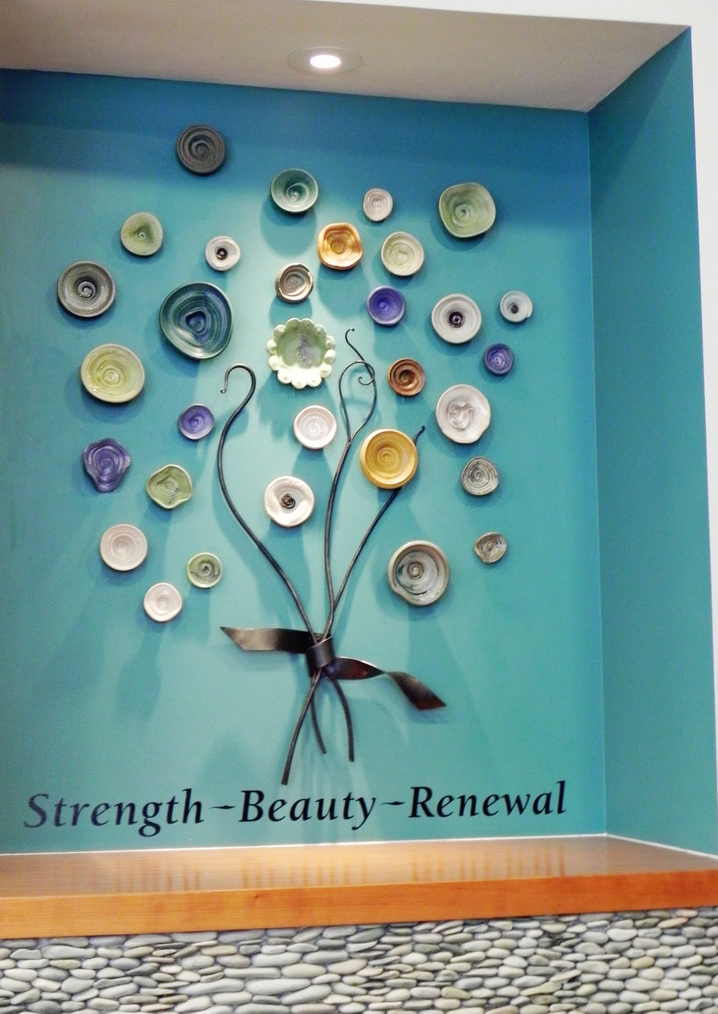 The artwork hanging above it is called "Bouquet - Stoneware & Forged Iron" by Janice Arone.